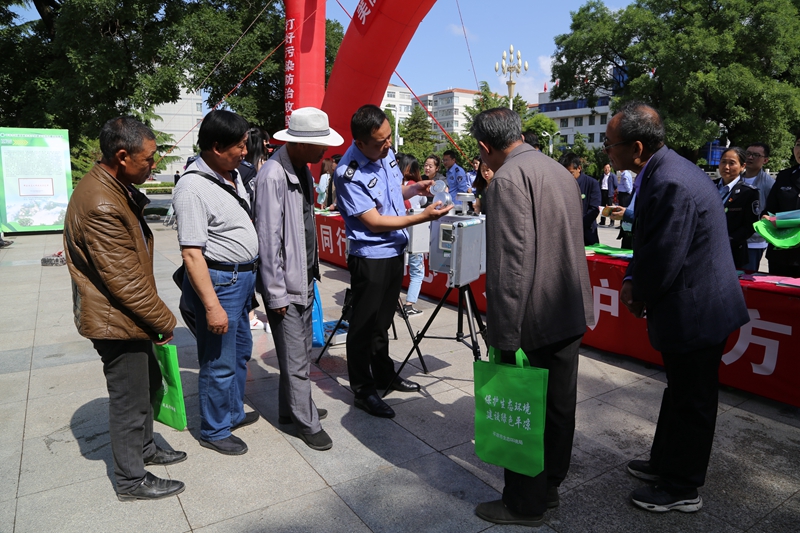 (工作人員向現(xiàn)場群眾演示講解便攜式生態(tài)環(huán)境監(jiān)測設(shè)備儀器的原理和使用方式)